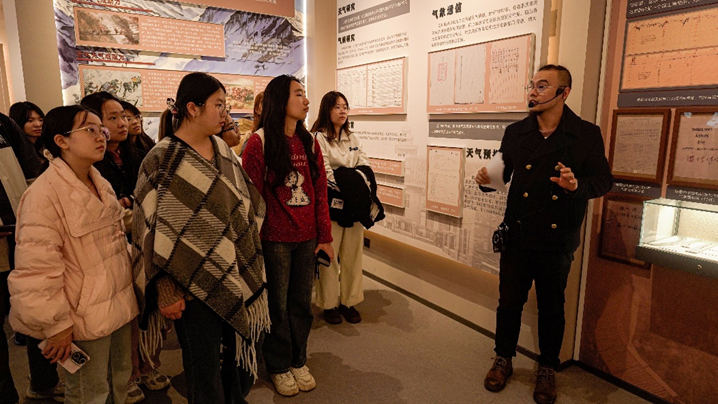 在四川气象史馆展厅里,讲解员以四川气候特征为切入点,系统梳理了气象事业的发展历程。从古代经验性观测,到现代卫星遥感与自动站网构成的立体监测体系,一幅气象事业持续跃升的历史画卷徐徐展开。现场,讲解员清唱《气象员之歌》,质朴而真挚的旋律深深打动了在场师生,使大家深切感受到老一辈气象工作者在艰苦环境下的敬业精神与使命担当。