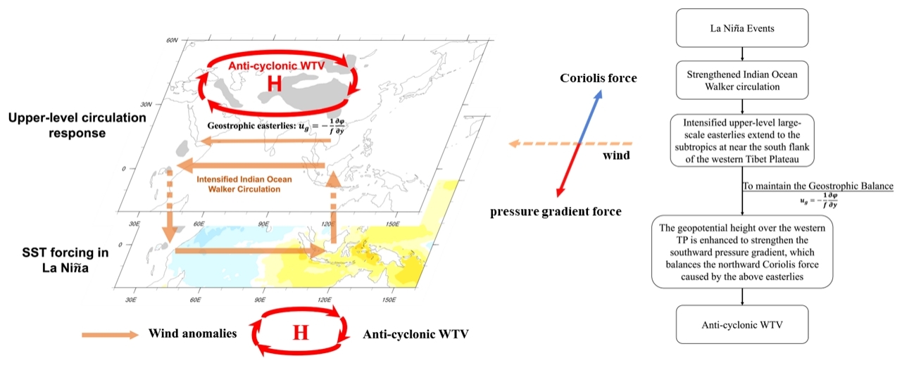 近日,大气科学学院2021级硕士生蒋阳杰在客座中山大学期间,与中山大学和英国纽卡斯尔大学研究人员合作,于国际知名期刊《Journal of Climate》(IF:4.0,JCR一区)在线发表了研究论文《Impacts of ENSO on Atmospheric Circulation over the Western Tibetan Plateau in Autumn》。该研究在观测资料中发现,ENSO与WTV在秋季的联系最为显著,La Niña(El Niño)事件对应着反气旋型(气旋型)WTV,此外,秋季耦合的程度随ENSO强度增强而增强。海温强迫试验验证了秋季ENSO对WTV的这种影响,尽管在强迫试验中引起的异常响应强度略弱,进一步的数值模拟试验发现热带西太平洋是ENSO对青藏高原大气环流产生影响的关键区域。该研究提出一种可能的机制:在拉尼娜(厄尔尼诺)事件期间,增强(减弱)的印度洋沃克环流导致热带印度洋上空对流层上部出现显著的东风(西风)异常。这些异常风场能够延伸至青藏高原南缘附近的亚热带区域。为维持准地转平衡,青藏高原的位势高度增加(减少),导致青藏高原出现反气旋性(气旋性)异常。而ENSO更强则会导致青藏高原南缘附近出现更强的纬向风异常,进而引发更强的WTV。这些结果有助于理解热带与青藏高原气候之间的耦合过程,同时对理解青藏高原气候的主导因素具有重要意义。