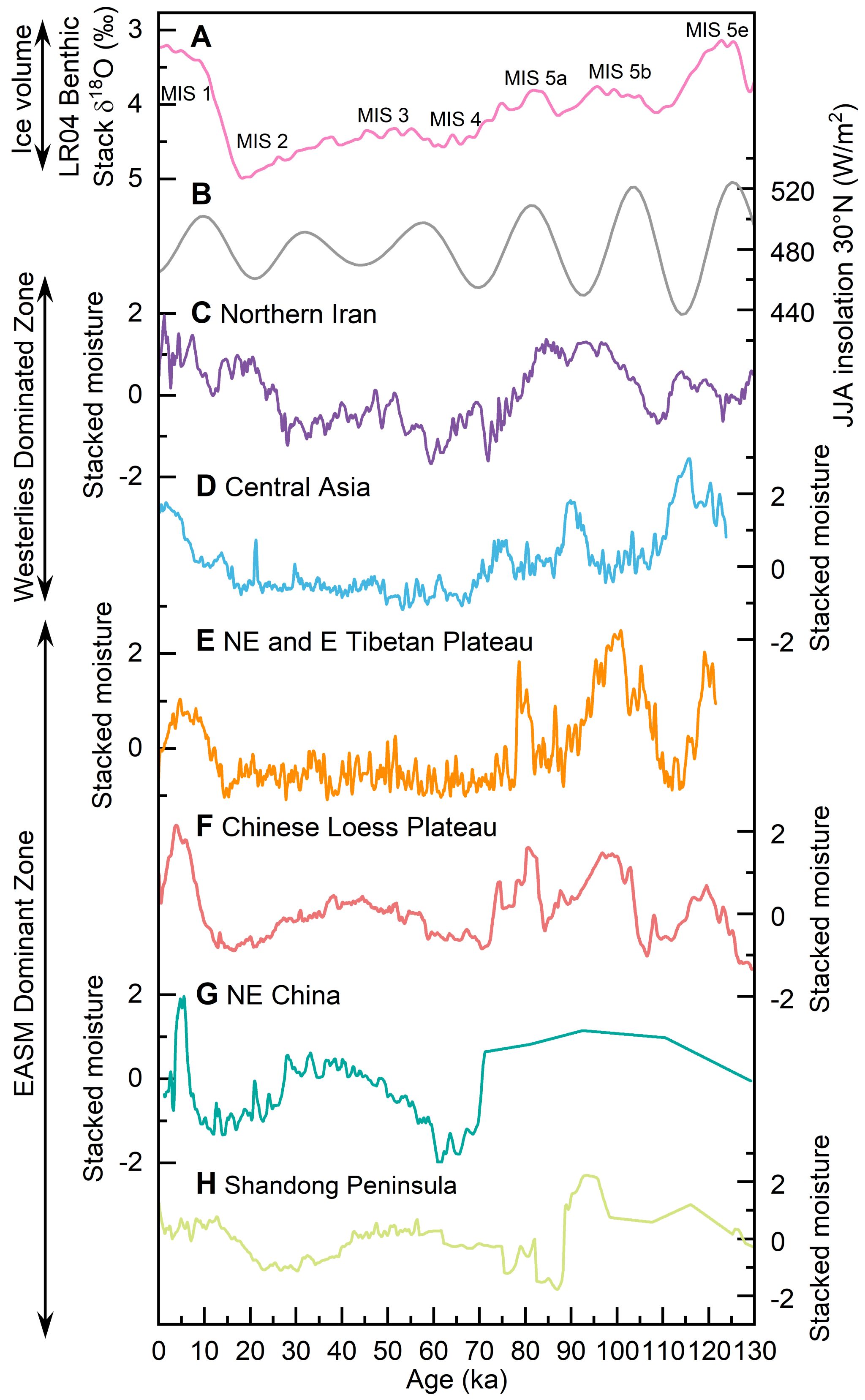 亚洲气候变化受中纬度西风、东亚与南亚夏季风以及东亚冬季风等多种大尺度环流系统共同影响。这些气候系统的强弱波动及其相互作用深刻塑造了亚洲区域水文气候格局,并对数十亿人口的生存环境与社会发展产生深远影响。然而,不同气候系统的演变过程及其驱动机制,以及它们对亚洲气候变化空间分异的影响仍存在较大争议。主要原因在于,现有研究多集中于全新世(约1.2万年)以来的较短时间尺度,缺乏更长时间尺度的高质量气候记录,对整个亚洲大陆范围气候变化空间差异的认识仍较为不足。